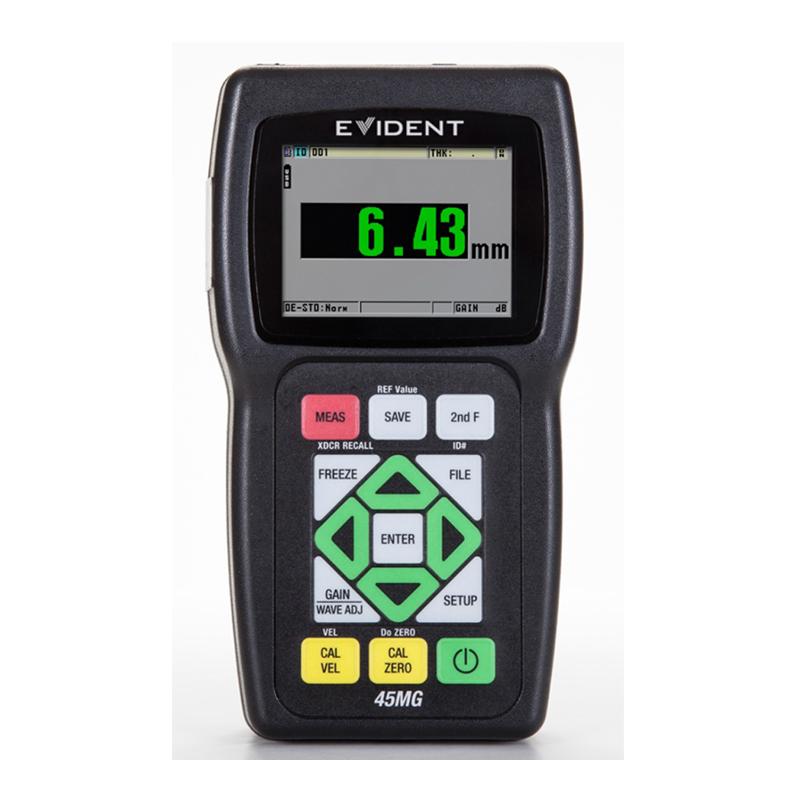 The Evident 45MG is an advanced, rugged ultrasonic thickness gauge designed to deliver accurate, reliable, and repeatable measurements across a wide range of inspection applications. Built for corrosion monitoring, precision thickness testing, and demanding industrial environments, the 45MG combines powerful performance with simple operation. Compatible with the complete range of Evident dual element and single element transducers, it easily adapts from a basic corrosion gauge to a multi-purpose precision instrument through optional software upgrades, making it ideal for both field and plant inspections.